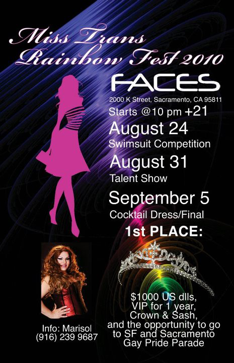 Poster for a "Transsexual Beauty Concert" on a local Night Club during the event Rainbow Fest on the Area of Sacramento, California. We created a poster for the Miss Trans Rainbow Fest for a local nightclub, as part of the Rainbow Fest event in Sacramento.